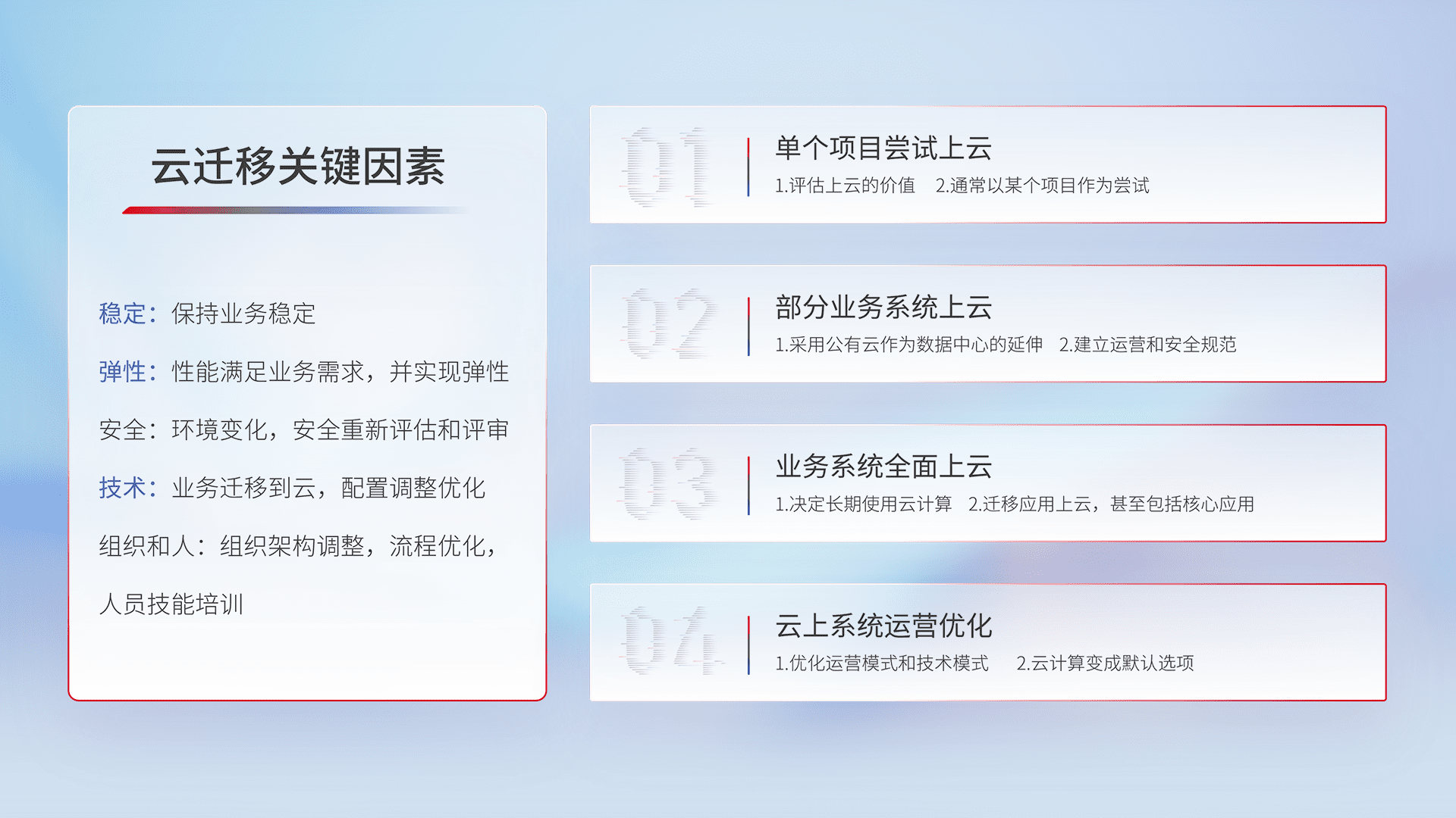 结合实际业务,,从规划设计、、云平台选型、、、云原生改造、、、、数据迁移、、、集成交付,,,迁移全过程为客户识别最佳上云路径,,,做好风险识别管理,,设计网络架构、、、身份权限、、、、安全审计合规、、操作审计、、日志审计、、、、监控告警策略、、、多站点容灾设计等,,,对云上基础设施进行整体规划,,,,提升IT治理水平,,以满足弹性、、高可用、、高性能的需求。。。。